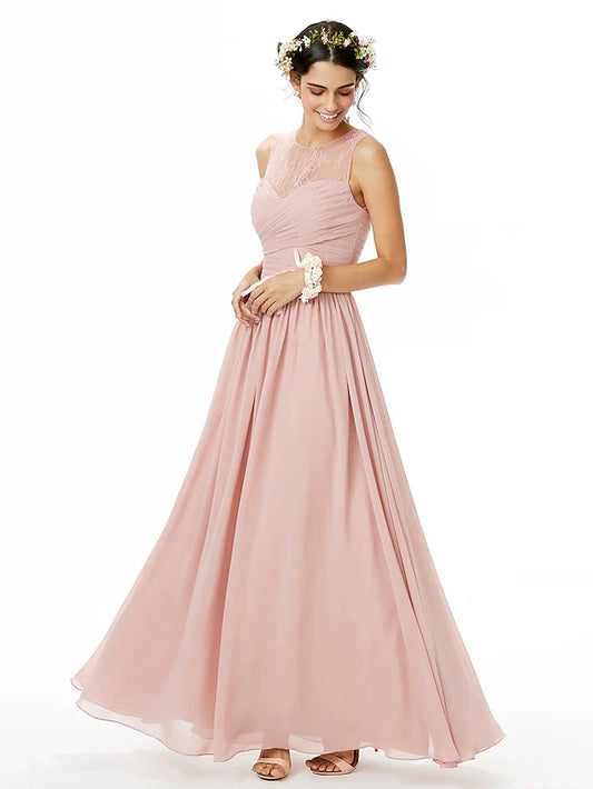 A-Line Bridesmaid Dress Jewel Neck Sleeveless Elegant Floor Length Chiffon / Lace with Sash / Ribbon / Pleats