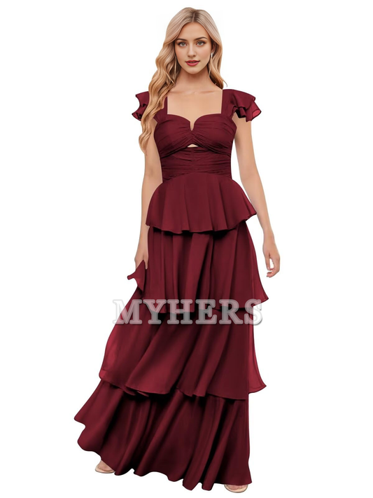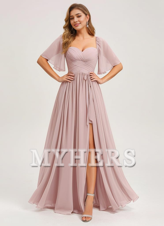 A Line Flutter Sleeves Ruched Chiffon Side Fork Long Bridesmaid Dresses Wedding Guests Dresses
