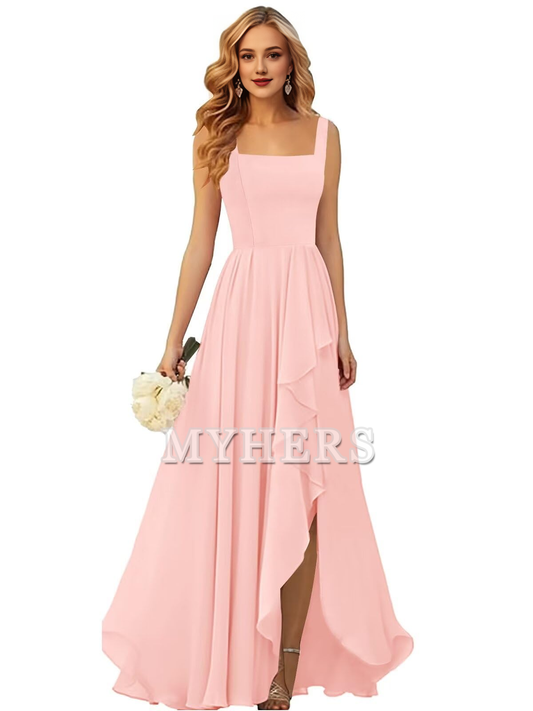 Elegant Simple Ruffle Square Neck Side Fork Long Bridesmaid Dresses Wedding Guests Dresses