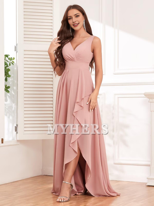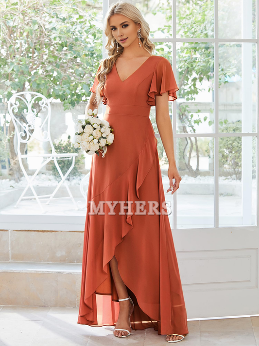 A Line V Neck Ruffle High Low Chiffon Elegant Simple Bridesmaid Dresses Wedding Guests Dresses