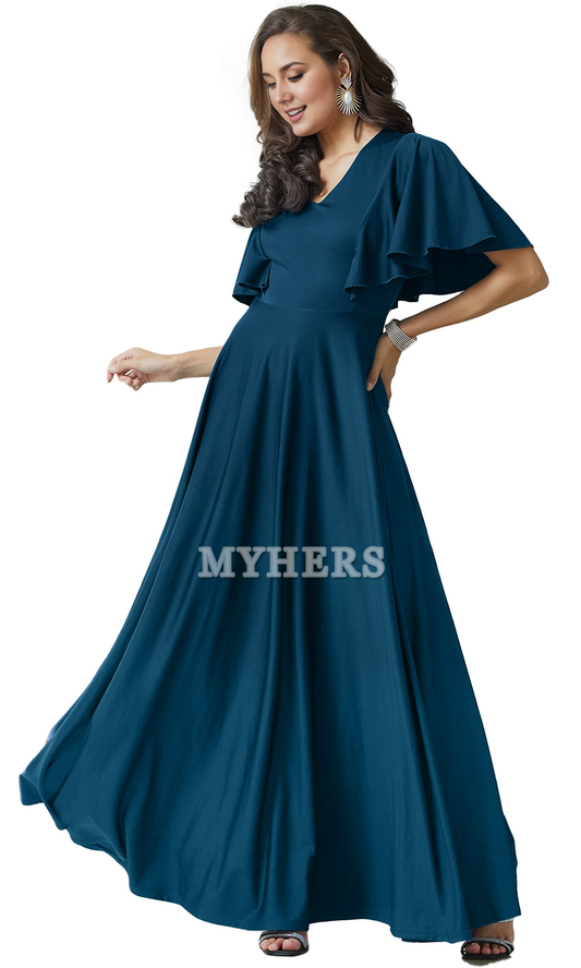 A Line V Neck Flutter Sleeve Long Elegant Bridesmaid Dresses Wedding Guests Dresses