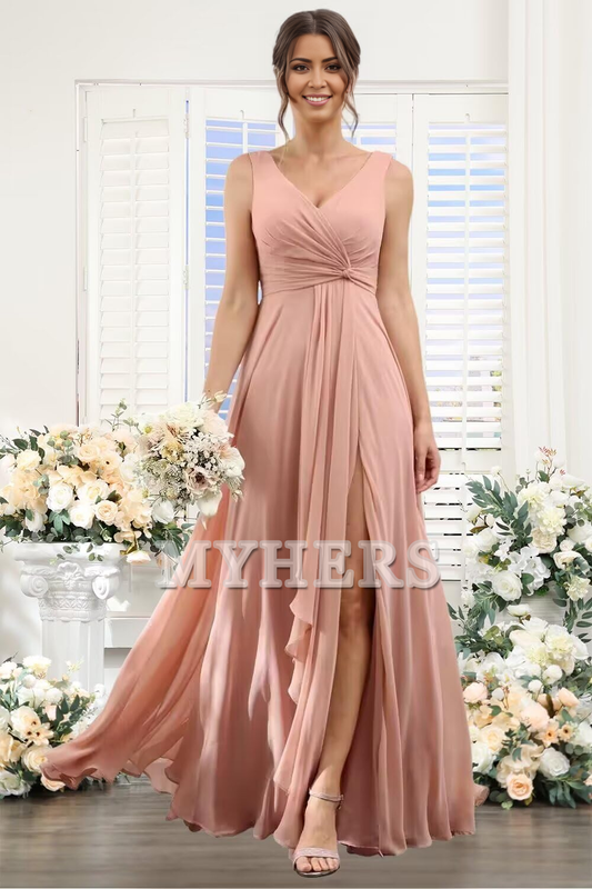Elegant V Neck Chiffon Ruched Side Fork Long Bridesmaid Dresses Wedding Guests Dresses