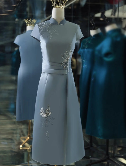 A-Line Cocktail Dresses Elegant Dress Wedding Party Tea Length Short Sleeve Stand Collar Satin with Appliques
