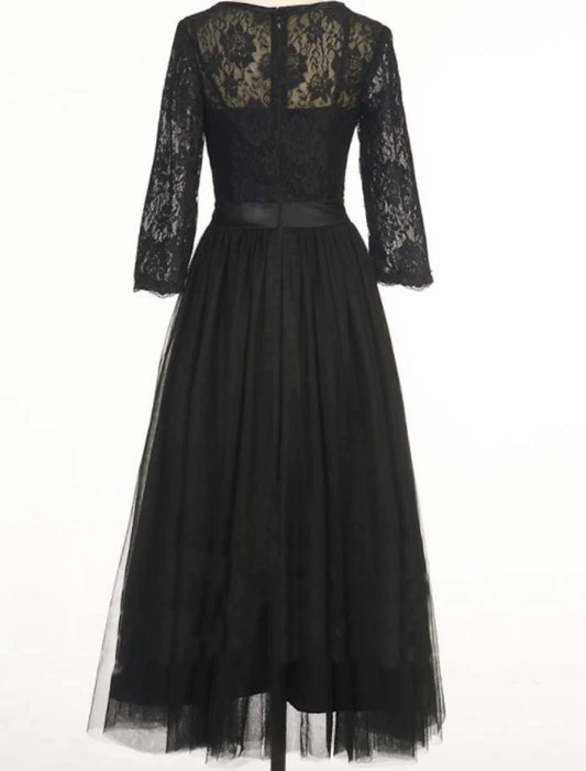 A-Line Cocktail Black Dress Vintage Dress Halloween Ankle Length 3/4 Length Sleeve Jewel Neck Fall Wedding Guest Tulle with Pleats Lace Insert