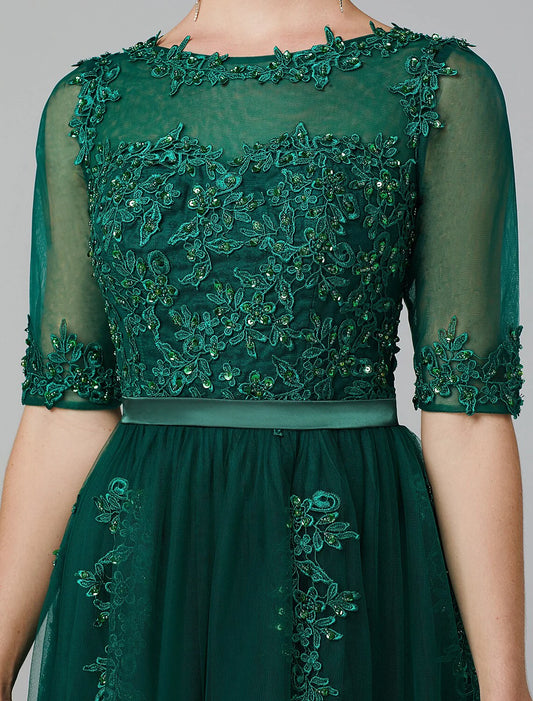 A-Line Cocktail Dress Christmas Red Green Dress Formal Evening Kentucky Derby Tea Length Sleeveless Illusion Neck Fall Wedding Guest Lace Over Tulle with Sequin Appliques