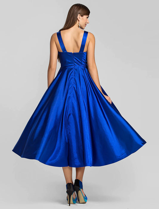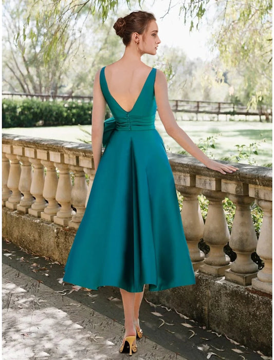 A-Line Cocktail Dresses Party Dress Wedding Guest Prom Tea Length Sleeveless Jewel Neck Satin V Back with Pleats Appliques