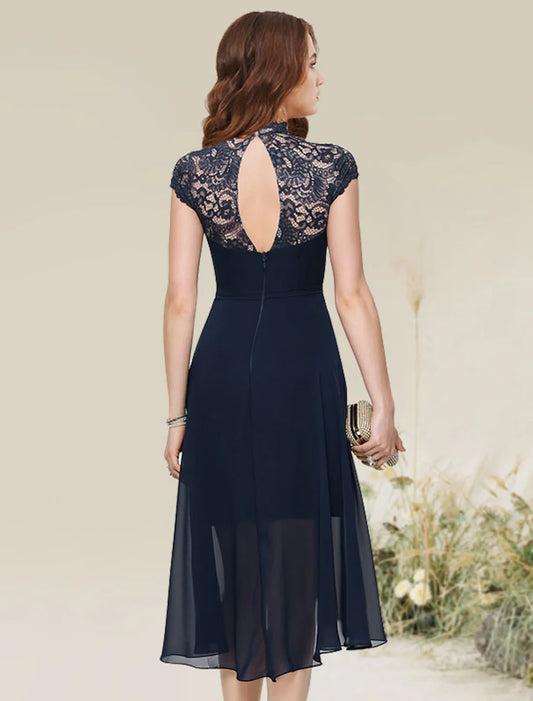 A-Line Cocktail Dresses Flirty Dress Homecoming Wedding Guest Asymmetrical Sleeveless Jewel Neck Chiffon with Lace Insert