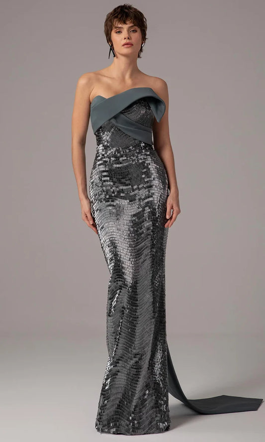 Dramatic Gunmetal Sequin Strapless Mermaid Gown with Oversized Bow Detail, Evening Dresses