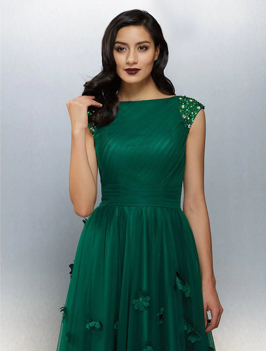 A-Line Floral Dress Wedding Guest Floor Length Short Sleeve Boat Neck Tulle with Crystals Appliques