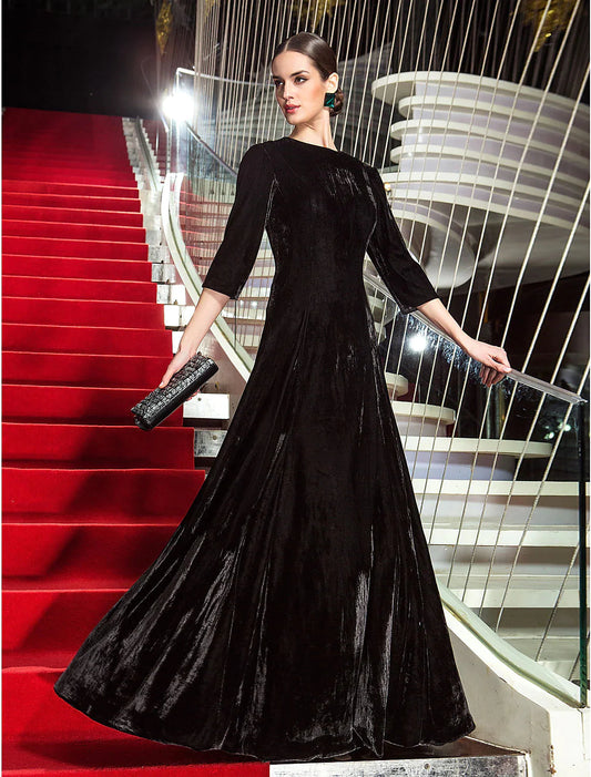 A-Line Celebrity Style Dress Wedding Guest Floor Length 3/4 Length Sleeve Jewel Neck Velvet with Pleats