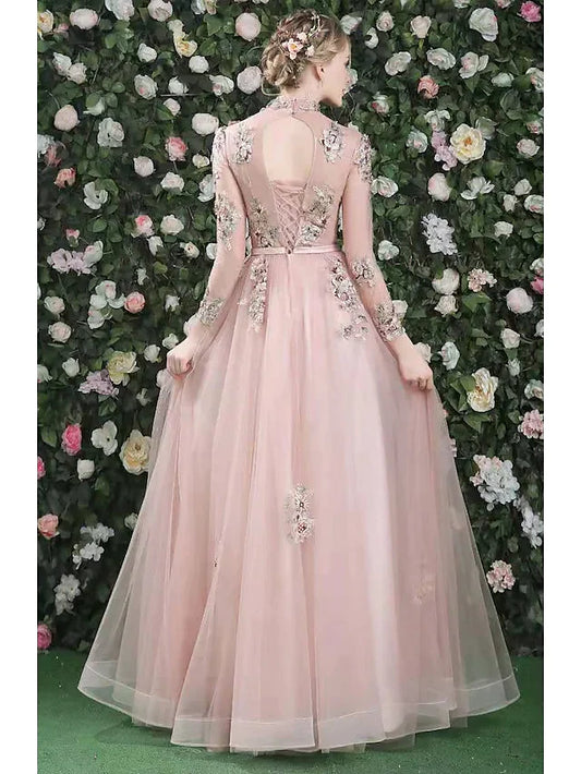 A-Line Cut Out Floral Prom Formal Evening Dress High Neck Long Sleeve Floor Length Organza with Embroidery