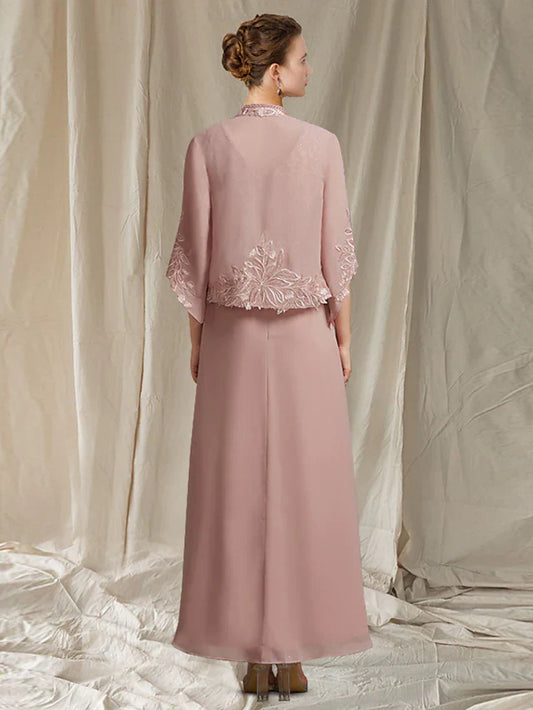Mother of the Bride Dress Elegant Wrap Included V Neck Ankle Length Chiffon Lace Sleeveless with Beading Appliques