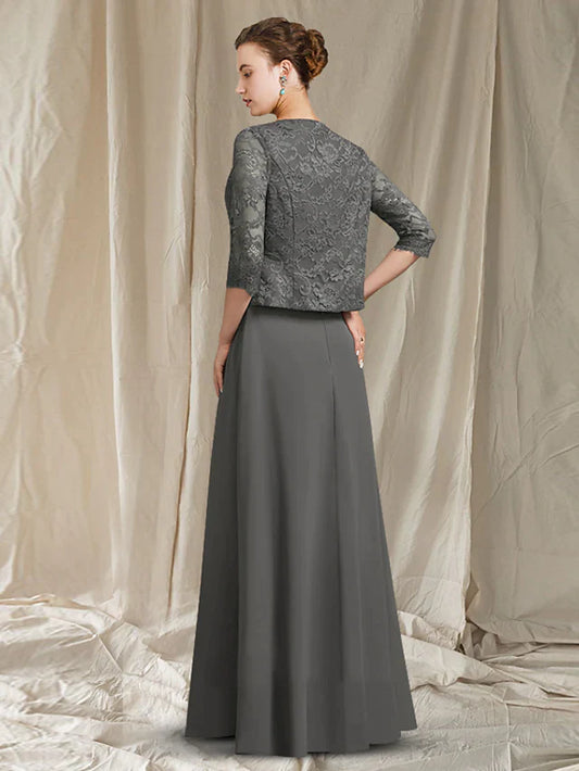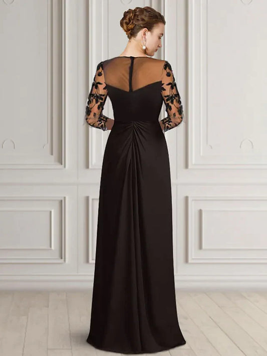 Mother of the Bride Dress Elegant Jewel Neck Floor Length Chiffon Lace 3/4 Length Sleeve with Appliques