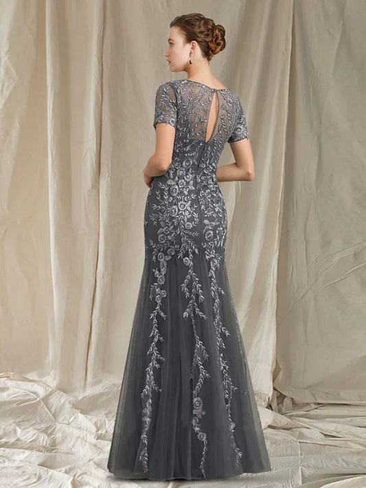 Mother of the Bride Dress Elegant Jewel Neck Floor Length Lace Tulle Short Sleeve with Appliques