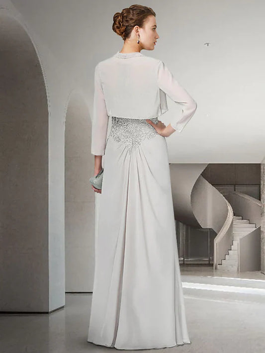 Mother of the Bride Dress Elegant Bateau Neck Floor Length Chiffon Tulle Half Sleeve with Beading