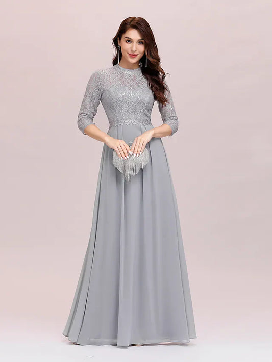 A-Line Mother of the Bride Dress Plus Size Elegant Jewel Neck Floor Length Chiffon Lace Length Sleeve with Lace