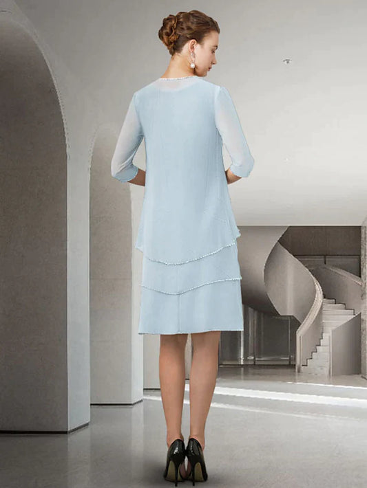 Mother of the Bride Dress Elegant Jewel Neck Knee Length Chiffon Long Sleeve with Beading