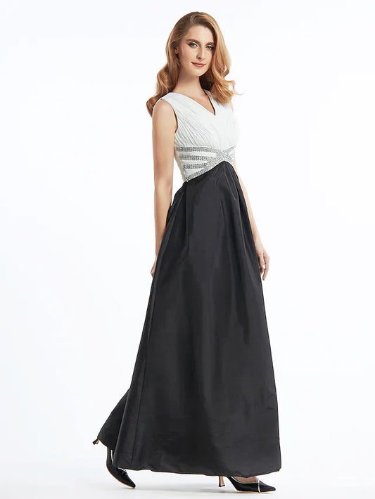 A-Line Mother of the Bride Dress Color Block V Neck Ankle Length Chiffon Taffeta Sleeveless with Criss Cross Beading