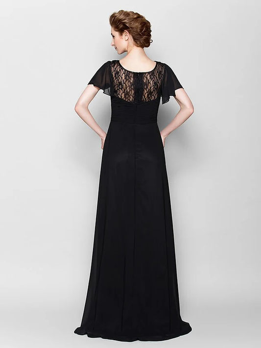 A-Line Mother of the Bride Dress See Through Bateau Neck Floor Length Chiffon Short Sleeve with Beading