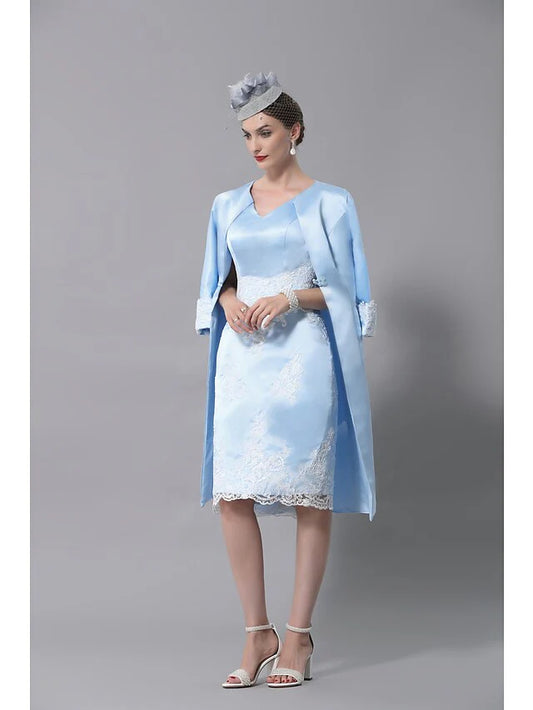 Mother of the Bride Dress Elegant Jewel Neck Knee Length Lace Satin Half Sleeve with Appliques