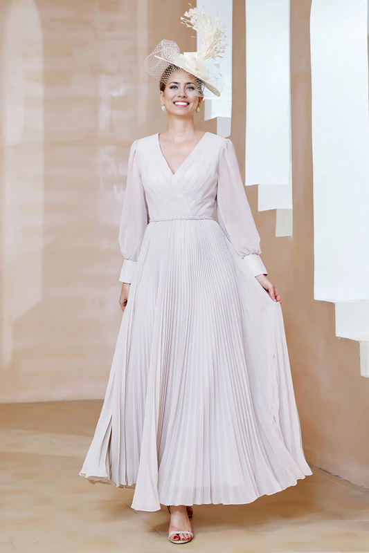 Fall November December Wedding Guest Dress Mother of the Groom / Bride Dresses V-Neck Long Sleeves Pleated Long Dress