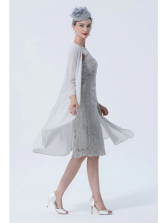 Mother of the Bride Dress Elegant Jewel Neck Knee Length Lace Satin Length Sleeve with Appliques