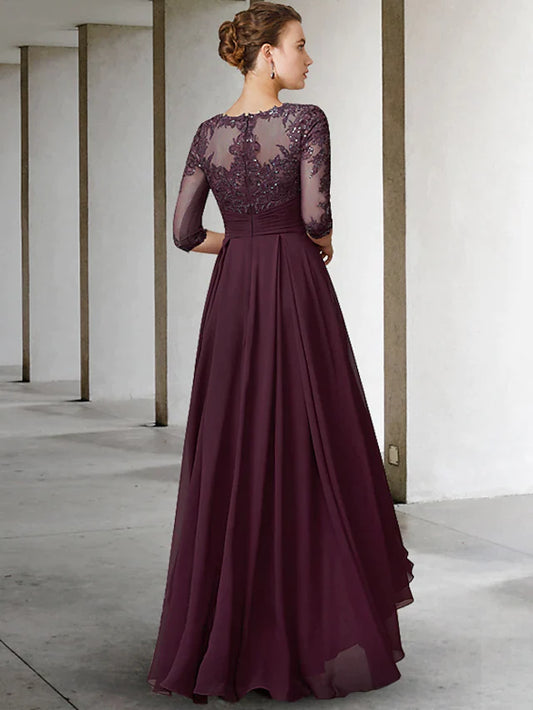 A-Line Mother of the Bride Dress Elegant Jewel Neck Asymmetrical Floor Length Chiffon Lace Half Sleeve with Pleats Appliques