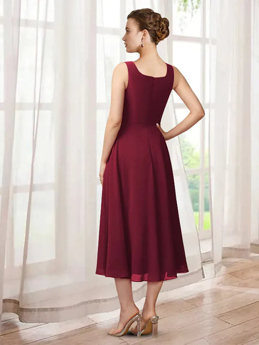 Mother of the Bride Dress Elegant Jewel Neck Tea Length Chiffon Lace Sleeveless with Appliques