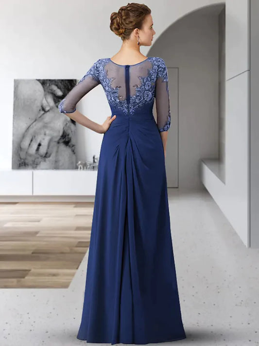 Mother of the Bride Dress Elegant Jewel Neck Floor Length Chiffon Lace 3/4 Length Sleeve with Appliques Ruching