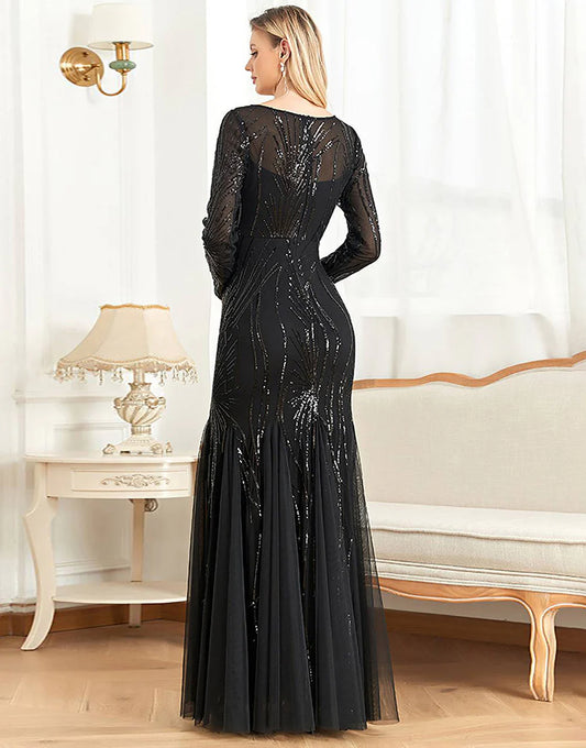 Mermaid Sequins Boat Neck Black Mother of the Bride Dress with Long Sleeves