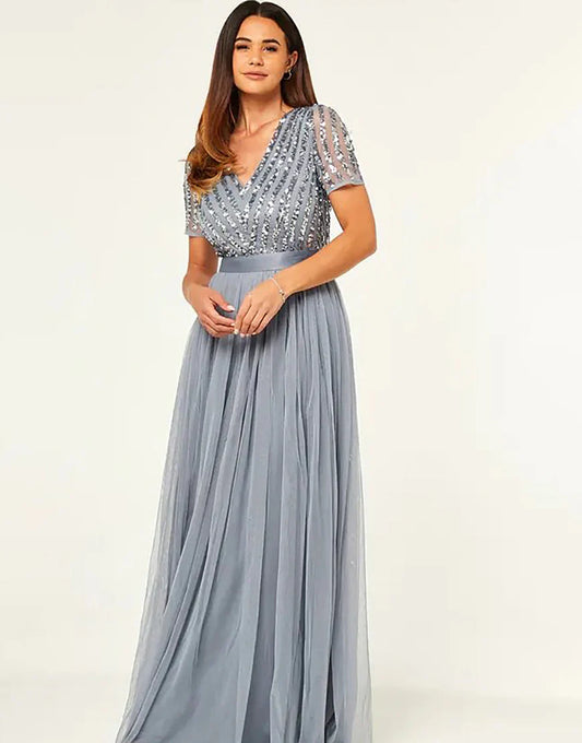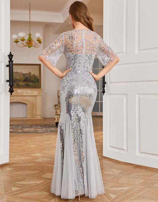 Sparkly V-Neck Grey Formal Dress with Short Sleeves