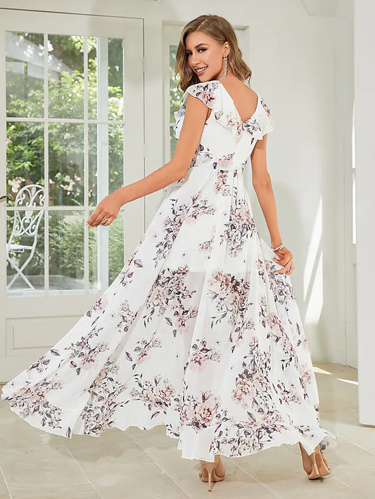 A-Line Wedding Guest Dresses Floral Dress Party Wear Asymmetrical Sleeveless V Neck Chiffon with Ruffles Strappy