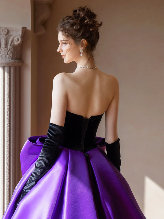 A-Line Strapless Party Dress with Bow Black Velvet and Satin Long Prom Dress