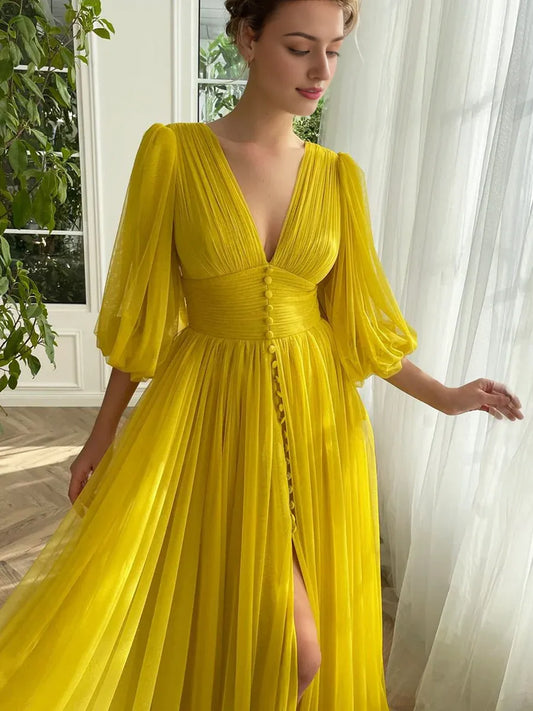 A-line Yellow V-Neck Chiffon Half Sleeve Party Dress Long Prom Dress