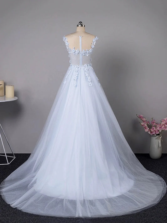 A-Line Evening Party Dress Sweep/Brush Train Light Blue Tulle Lace Long Prom Dress