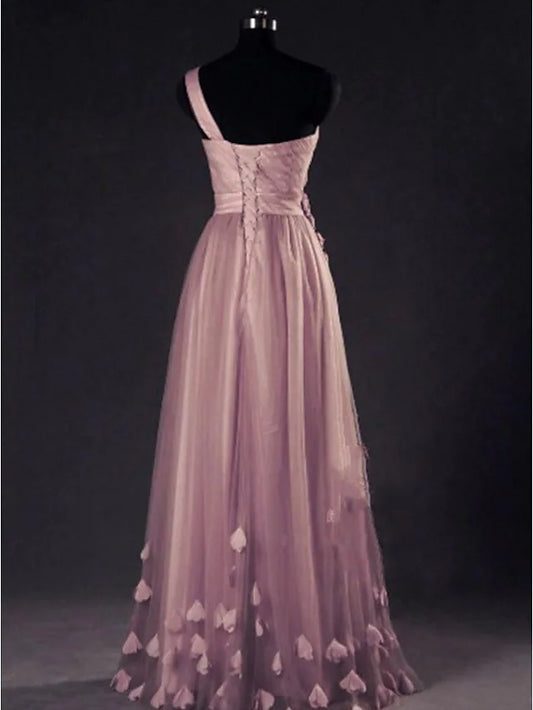 A-Line Prom Dresses Elegant Dress Wedding Guest Floor Length Sleeveless One Shoulder Tulle with Appliques