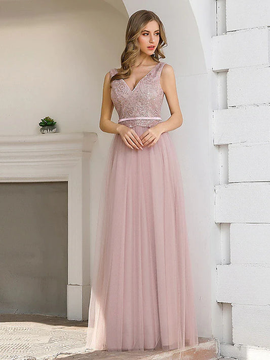 A-Line Minimalist Elegant Party Wear Prom Dress V Neck Sleeveless Floor Length Tulle with Pleats Appliques