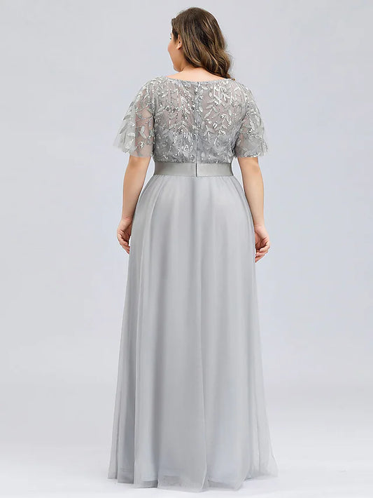 A-Line Prom Dresses Plus Size Dress Wedding Guest Floor Length Short Sleeve Jewel Neck Chiffon with Appliques