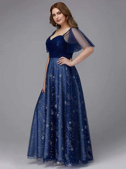 A-Line Plus Size Dress Prom Floor Length Short Sleeve Sweetheart Tulle Lace-up with Beading Pattern / Print