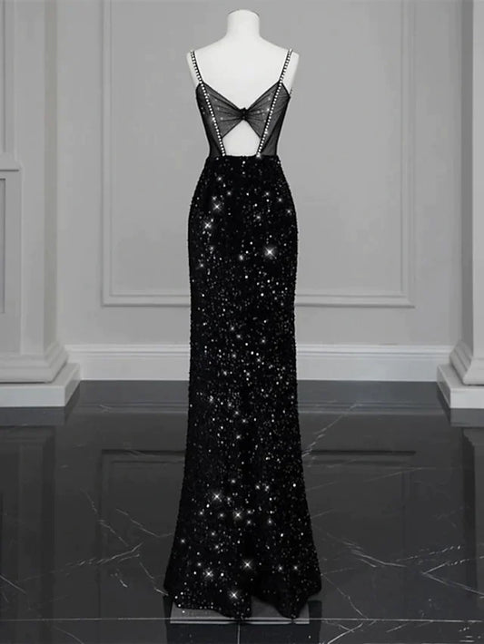 Mermaid / Trumpet Evening Gown Sexy Dress Formal Floor Length Sleeveless Spaghetti Strap Sequined with Bow(s) Crystals Sequin