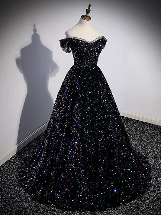A-Line Prom Dresses Princess Dress Prom Floor Length Short Sleeve Sweetheart Tulle with Sequin