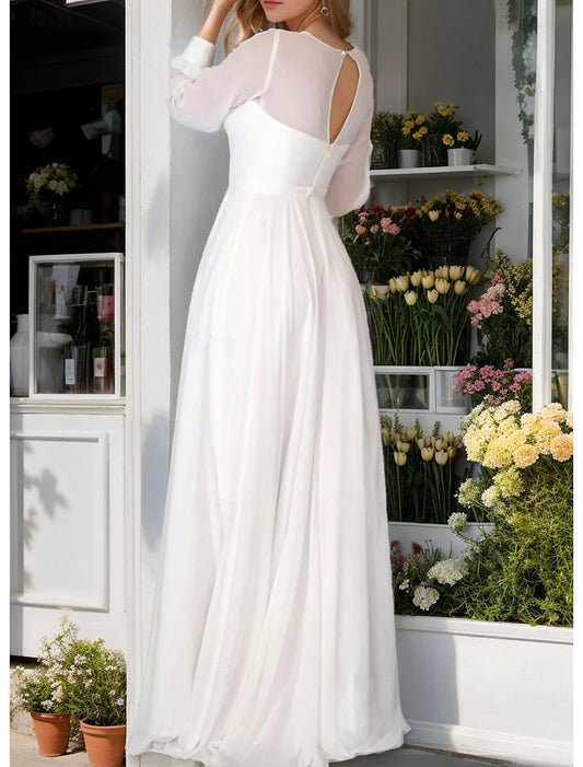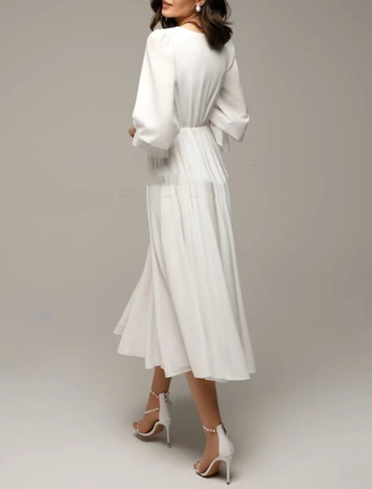 Fall November December Wedding Dresses Simple A-Line V Neck Long Sleeve Ankle Length Chiffon Bridal Gowns With Solid Color Little White Dresses