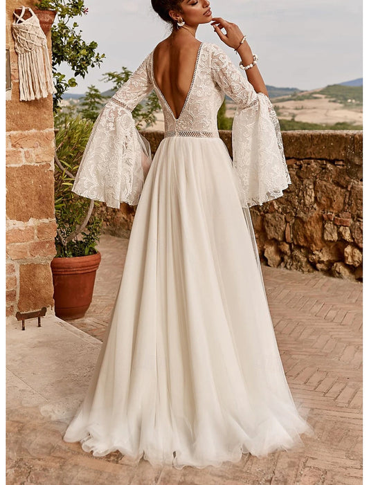 Fall November December Wedding Dresses A-Line V Neck Long Sleeve Sweep / Brush Train Lace Draping Fantastic Bridal Gowns