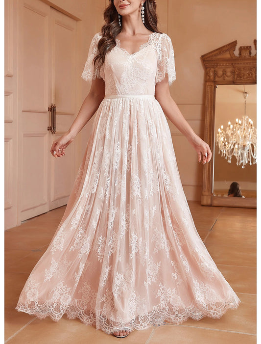 Fall November December Wedding Dresses A-Line V Neck Short Sleeve Floor Length Lace Pleats Sweet Elegant Bridal Gowns