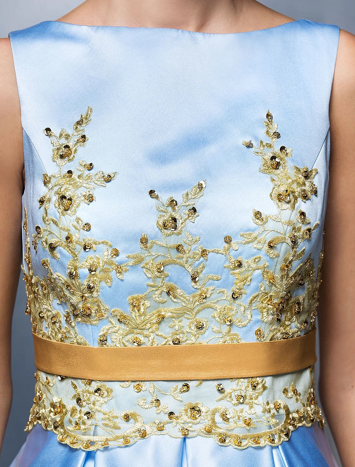A-Line Cocktail Dresses Party Dress Wedding Guest Prom Tea Length Sleeveless Jewel Neck Satin V Back with Pleats Appliques
