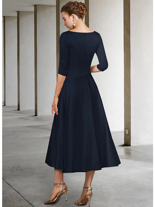 A-Line Mother of the Bride Dress Elegant V Neck Tea Length Satin Half Sleeve with Pleats Ruching