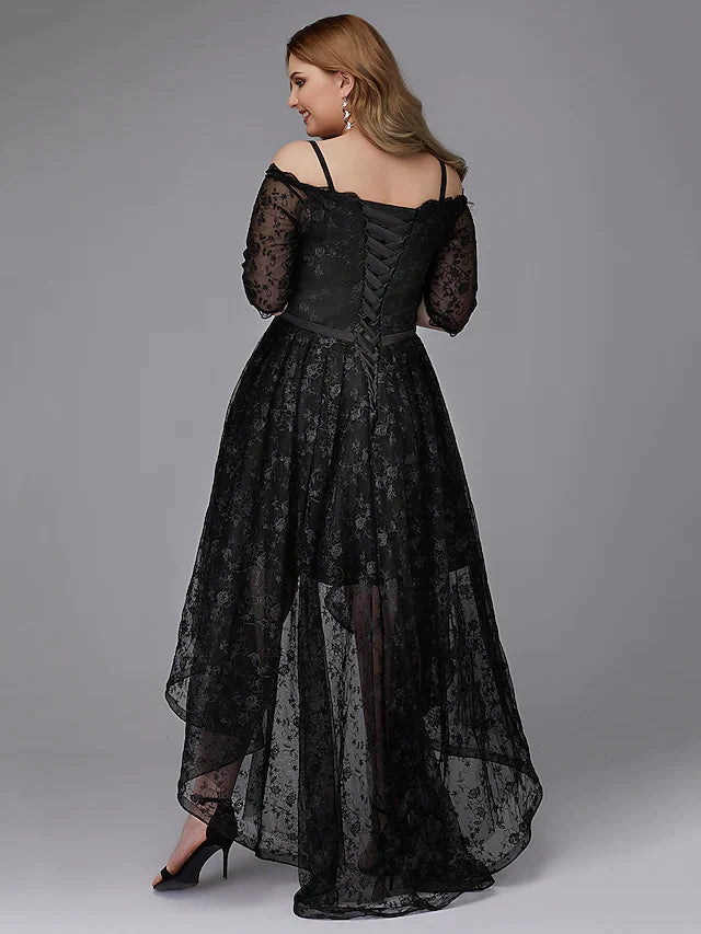 A-Line Plus Size Cocktail Party Prom Dress Spaghetti Strap Half Sleeve Asymmetrical Lace with Pleats Lace Insert