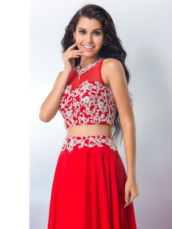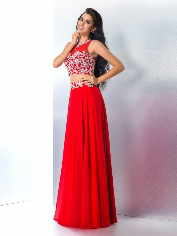 A-Line/Princess Sheer Neck Applique Sleeveless Long Chiffon Two Piece Dresses