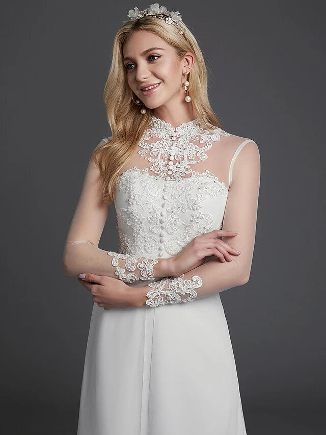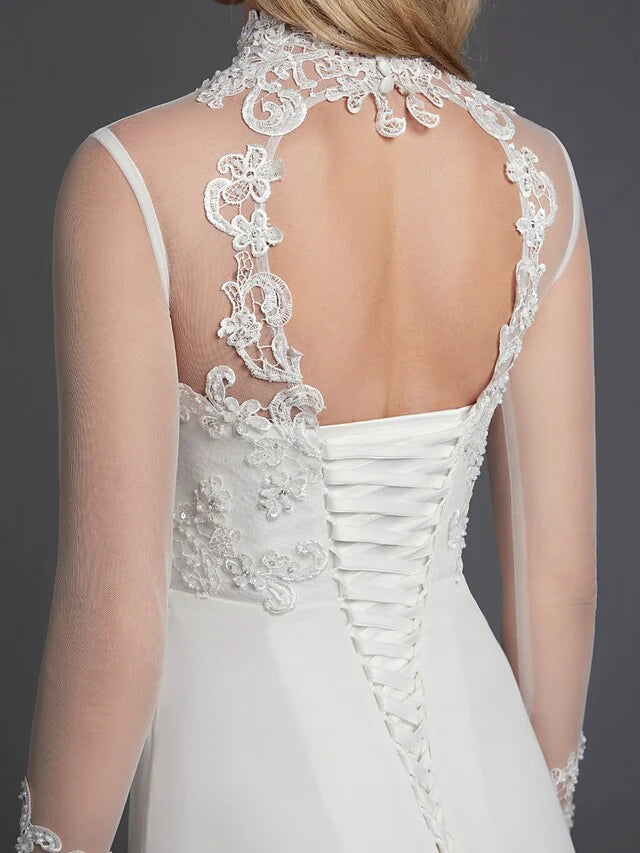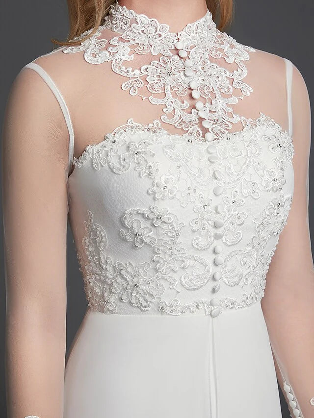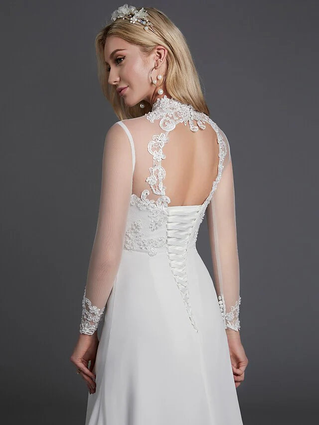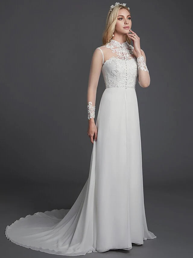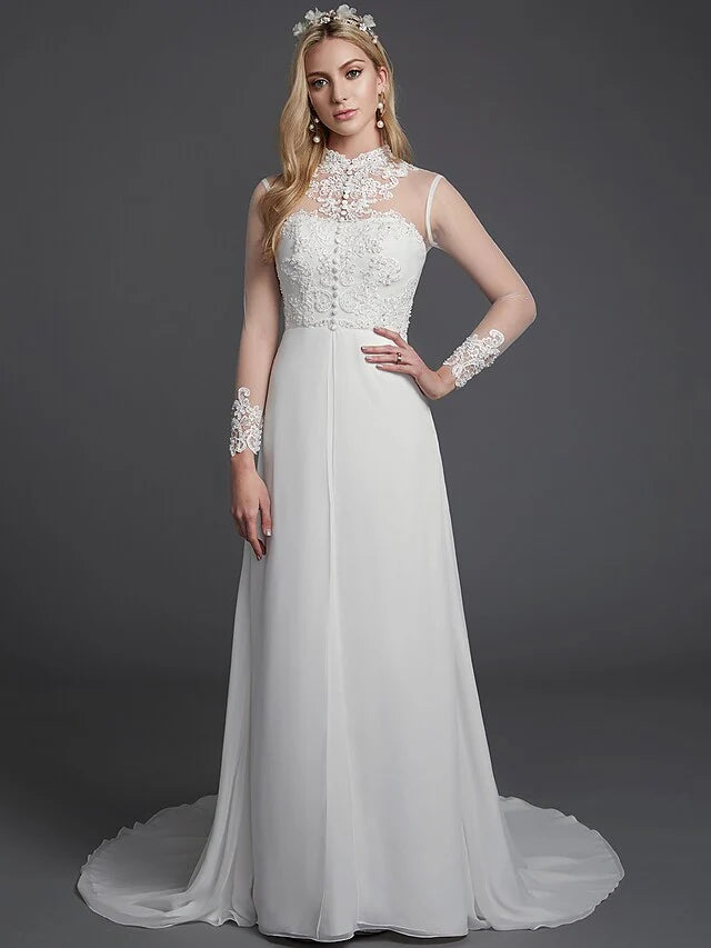 A-Line Wedding Dresses High Neck Court Train Chiffon Lace Long Sleeve Vintage Plus Size Backless with Lace Buttons