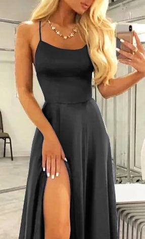 Black Square Neck Halter Lace-Up Back Backless A Line Satin Prom Dress